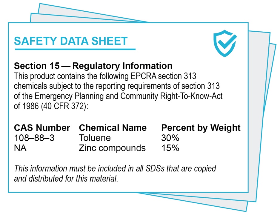 The required notification must be provided at least annually in writing. Acceptable forms of notice include letters, product labeling, and product literature distributed to customers. If you are required to prepare and distribute a Safety Data Sheet (SDS) for the mixture under the Occupational Safety and Health Act (OSHA) Hazard Communication Standard, your section 313 notification must be attached to the SDS or the SDS must be modified to include the required information. A sample letter and recommended text for inclusion in an SDS appear in Section 9.0 and Section 10.0.
