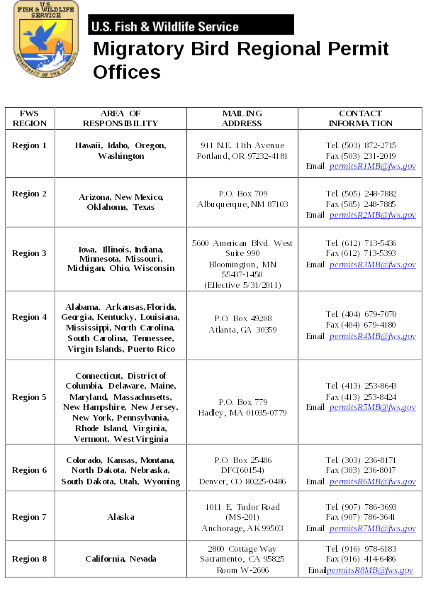 | In accordance with the Paperwork Reduction Act of 1995 (44 U.S.C. 3501, et seq.) and the Privacy Act of 1974 (5 U.S.C. 552a), please be advised: 1. The gathering of information on fish and wildlife is authorized by: (Authorizing statutes can be found at: http://www.gpoaccess.gov/cfr/index.html and http://www.fws.gov/permits/ltr/ltr.html.) a. Bald and Golden Eagle Protection Act (16 U.S.C. 668), 50 CFR 22; b . Migratory Bird Treaty Act (16 U.S.C. 703-712), 50 CFR 21; c. General Provisions, 50 CFR 10; d . General Permit Procedures, 50 CFR 13; and e . Wildlife Provisions (Import/export/transport), 50 CFR 14. 2. Information requested in this form is purely voluntary. However, submission of requested information is a condition of your permit under the above laws. Failure to provide all requested information may be sufficient cause for the U.S. Fish and Wildlife Service to revoke your permit. Response is not required unless a currently valid Office of Management and Budget (OMB) control number is displayed on form. |