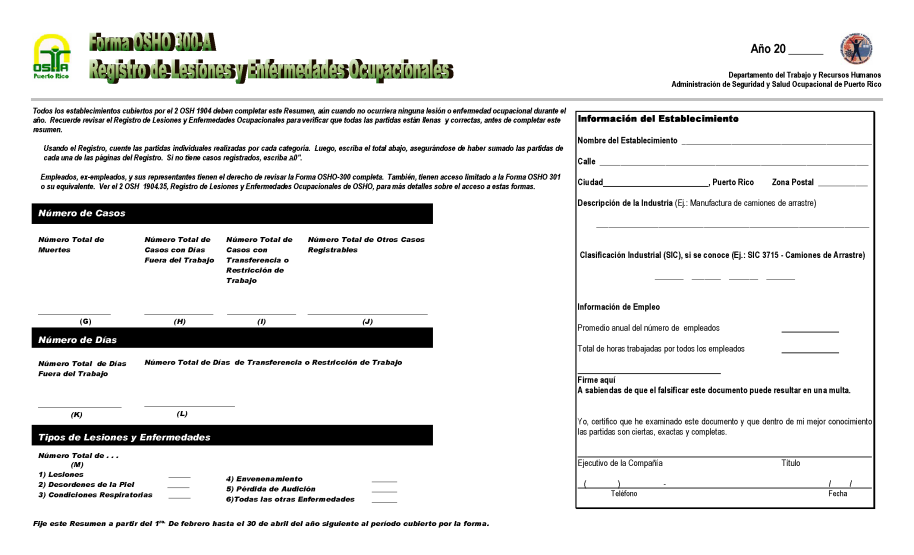 Esta encuesta requiere al patrono que provea información sobre lesiones y enfermedades relacionadas con el trabajo basada en los datos que han mantenido durante el año calendario 2019 en sus Formas para Registrar Lesiones y Enfermedades Ocupacionales de la Administración de Seguridad y Salud Ocupacional (OSHA). Copias de estas formas le fueron enviadas por correo a finales del 2018. Bajo la Ley Pública 91-596, todos los establecimientos que reciban esta encuesta obligatoria, deben completarla y devolverla dentro de 30 días aunque no hayan tenido lesiones y enfermedades relacionadas al trabajo durante el 2019. Las siguientes instrucciones detallan los pasos para completar la encuesta, independientemente de que su establecimiento tuvo o no casos de lesiones o enfermedades en el 2019.