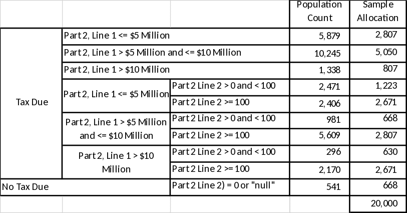 Tables 1 – 12 below show the potential respondent universe (population count), stratification plan, and sample allocations for each survey and special study for which a sampling plan exists as of the date this request was submitted. When sub-populations vary considerably, it is advantageous to sample each subpopulation (stratum) independently. Stratification is the process of grouping members of the population into relatively homogeneous sub-groups before sampling. The strata should be: