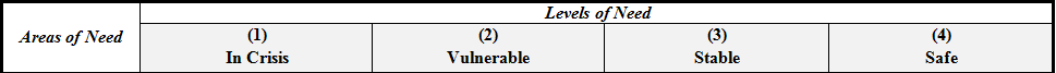 In this example, the program recorded the Support System in the U.S. level of need for clients at intake (N= ). Twenty were at the crisis level and 40 were at the vulnerable level. At the end of the reporting period, the program reassessed the clients’ level of need. Ten clients moved from crisis to stable, 5 from crisis to safe, 25 from vulnerable to stable, and 10 moved from vulnerable to safe. The total number of clients that moved from crisis and vulnerable to stable and safe during the reporting period was 50.