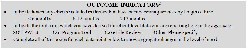 All grantees are required to collect and report aggregate program data for clients served through the ORR-funded Services for Survivors of Torture program. If a program has multiple funding sources, only clients served with ORR funding should be included. Client data, including levels of need in six domains, are captured at intake; levels of need in the six domains are also measured at follow-up assessments, forming the basis of program outcome indicators. If programs conduct multiple follow-up assessments, they are only required to report on comparing the levels of need between the first and last assessment (i.e., between intake and the last follow-up assessment). Program data points include both new and continuing clients, unless instructed otherwise.