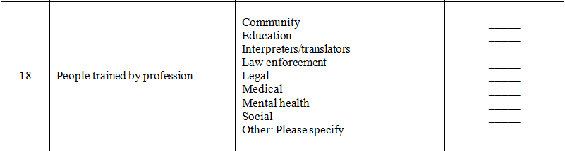 Indicate only the number of new and continuing primary clients who report being tortured for one or more of the reasons listed. These counts can be duplicated if a client reports multiple reasons for torture. If one reason significantly overlaps with another, list only the primary reason. If clients report a reason for torture that cannot be categorized into any of the options listed, please specify the reason(s) under “Other” and include a count for each reason specified.