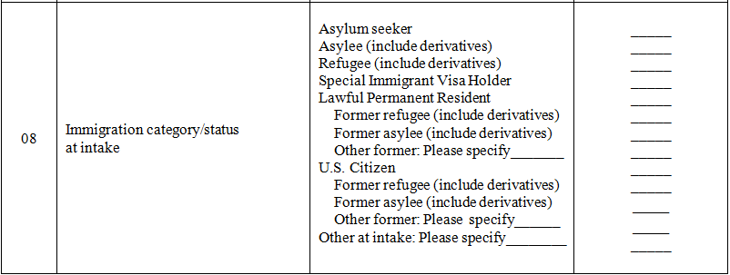 Indicate the number of new and continuing clients, primary and secondary, who fall into each of the immigration categories/statuses at intake. Indicate the latest (most recent) category/status for each client at intake. For example, a refugee generally becomes a lawful permanent resident (LPR) after one year and would be listed as an LPR if he or she were an LPR at intake. Also, indicate the former immigration category(ies)/status(es) for clients who are Lawful Permanent Residents and U.S. Citizens at intake. These counts should be unduplicated.