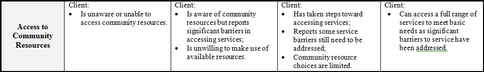 24. ACCESS TO COMMUNITY RESOURCES: Assesses the client’s knowledge and ability to access