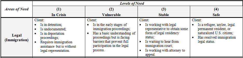 In this example the program recorded the Legal (immigration) levels of need for clients at intake (N= ). Fifteen were at the crisis level, 30 were at the vulnerable level, 27 were at the stable level, and 4 were at the safe level at intake. At the end of the reporting period, the program reassessed the clients’ level of need. Three clients moved from crisis to vulnerable, 10 moved from crisis to stable, and 2 from crisis to safe; 5 clients stayed vulnerable, 22 moved from vulnerable to stable, and 3 moved from vulnerable to safe; 15 clients stayed stable and 12 moved from stable to safe; 28 clients stayed at the safe level. The total number of clients that moved from crisis and vulnerable to stable and safe was 37.