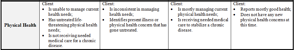 22. PHYSICAL HEALTH: Assesses the general physical well-being of the client. Use the SOT-PWI-S or convert your program tool’s assessment measure to the SOT-PWI-S levels of need for this domain.