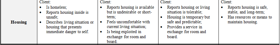 21. HOUSING: Assesses the client’s ability to obtain safe housing based on individual circumstances and local housing availability. Use the SOT-PWI-S or convert your program tool’s assessment measure to the SOT-PWI-S levels of need for this domain.