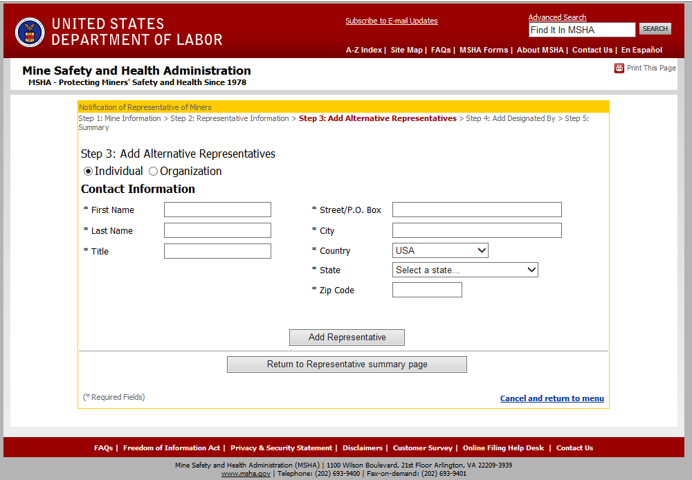 MSHA Form 2000-238 Representative of Miners Designation Form