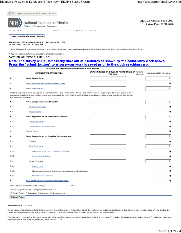 The survey obtains the distribution of expenditures incurred by recipients of biomedical research awards from the National Institutes of Health (NIH) and will provide information on how the NIH award amounts are expended across several major categories.