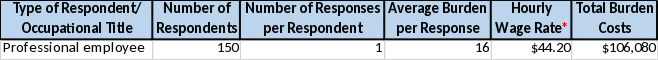 Provide estimates of annualized cost to respondents for the hour burdens for collections of information, identifying and using appropriate wage rate categories. The cost of contracting out or paying outside parties for information collection activities should not be included here. Instead, this cost should be included under ‘Annual Cost to Federal Government’.