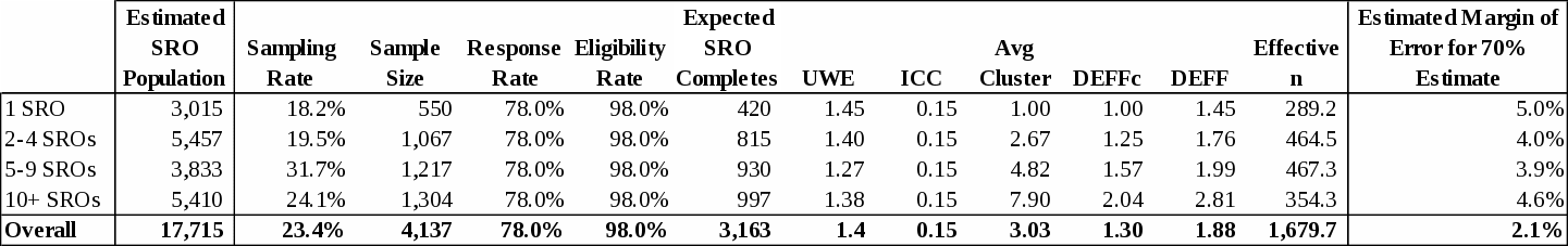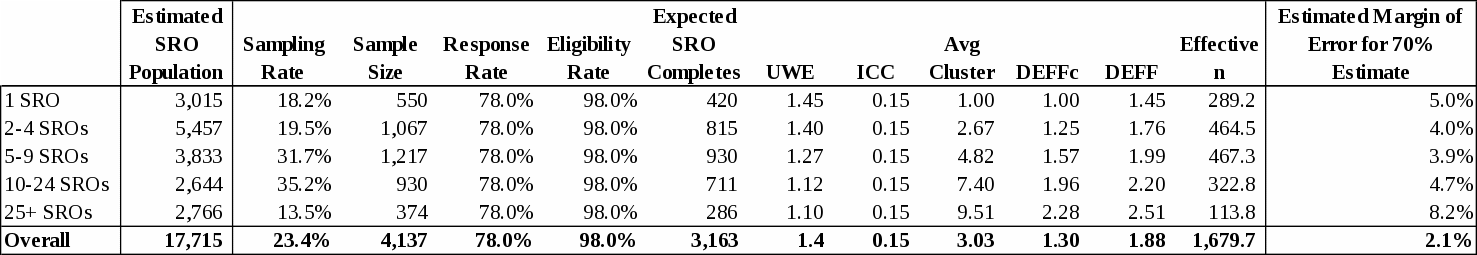 Table 8 shows these rates and expected sample sizes across strata using a starting sample of 4,137 SROs. This starting sample size is expected to yield 3,163 completed SRO questionnaires.