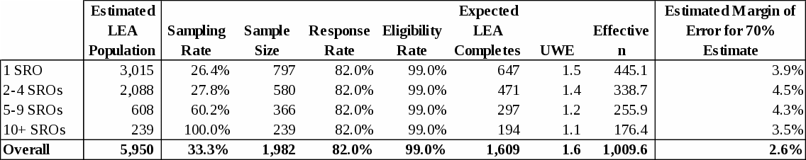 In the second stage of the SLEPS survey design, rostered SROs from responding LEAs constitute the sampling frame. While this effective frame is smaller than the SRO population of interest, to ensure representation of the overall population, adjusted LEA design-based weights accounting for nonresponse, ineligibility, and non-rostering will comprise the first component of the final SRO weight. Based on observations from the 2017 SLEPS pre-test, the following assumptions have been used for development of the SRO stage sample allocation: