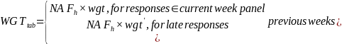 The non-response weight adjustment factor is applied to the current weekly panel and the late response units. The tabulation weight is calculated as follows:
