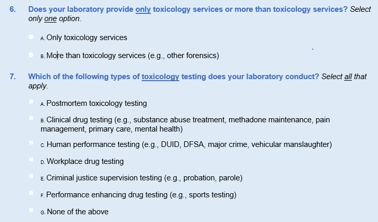 When we examined the 2017 responses for Question 6, more specific information was clearly needed with respect to toxicology testing to ensure clarity and data quality. Thus, a new Question 6 was added to ask whether the laboratory provides only toxicology services or more than toxicology services. New Question 6 is followed by a revised Question 7—a modified version of the original Question 6 from 2020—which asks respondents about the specific types of toxicology testing conducted. Questions 6 and 7 tested well during the cognitive interviews.