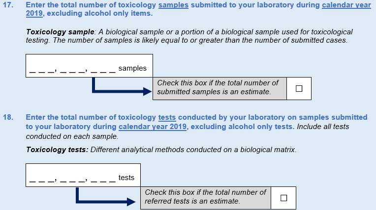 Finally, in the 2017 instrument, DEA asked about the number of toxicology cases referred to the laboratory. Expert panel participants pointed out that this question provides only a gross measure of workload, because they often receive several samples in a given case, which may be counted differently across laboratories. Thus, it was recommended that DEA inquire about the number of toxicology samples submitted to the laboratory with a follow-up question about the number of toxicology tests conducted on those samples. This resulted in new Questions 17 and 18. Estimate box options were included for both new questions to ease respondent burden.