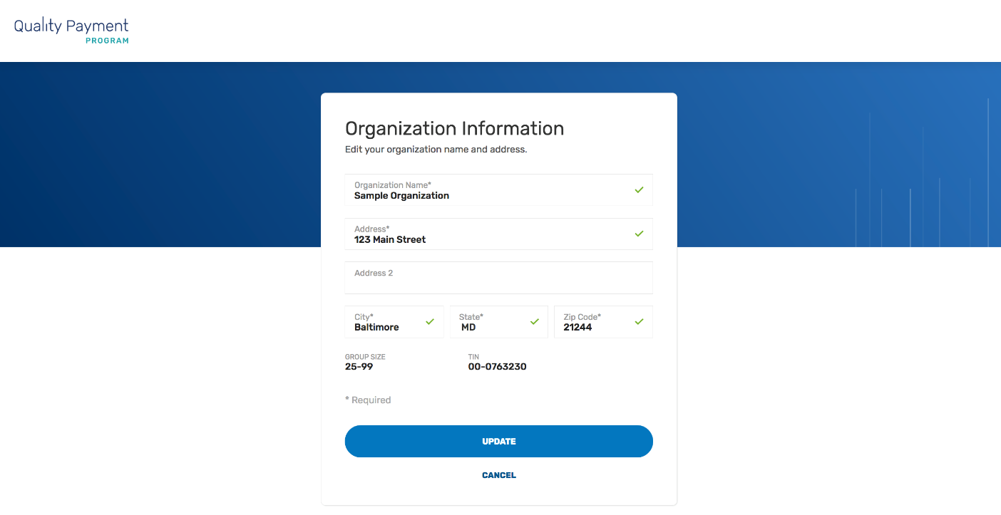 A green checkmark will appear after you enter each piece of required information. Once all required information has been entered, you will be able to select Update.”
