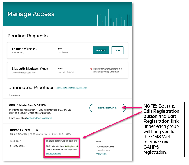 “9. In Manage Access, confirm you see a green checkmark next to CMS Web Interface (or CAHPS for MIPS Survey), indicating your successful registration for your group or virtual group. Note: If you’re adding a second registration for the same group or virtual group (i.e. registering for the CAHPS for MIPS survey after registering for the CMS Web Interface), the organization and contact information will carry over and you will only need to follow Steps 2 and 8.”