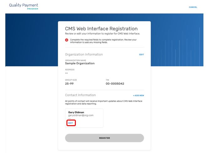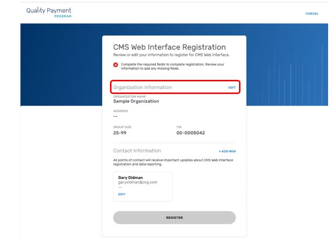“3. At this point, you will see limited organization and contact information displayed. To submit your registration, you will need to complete the required Organization and Contact information. Select Edit next to the Organization to complete the required information.