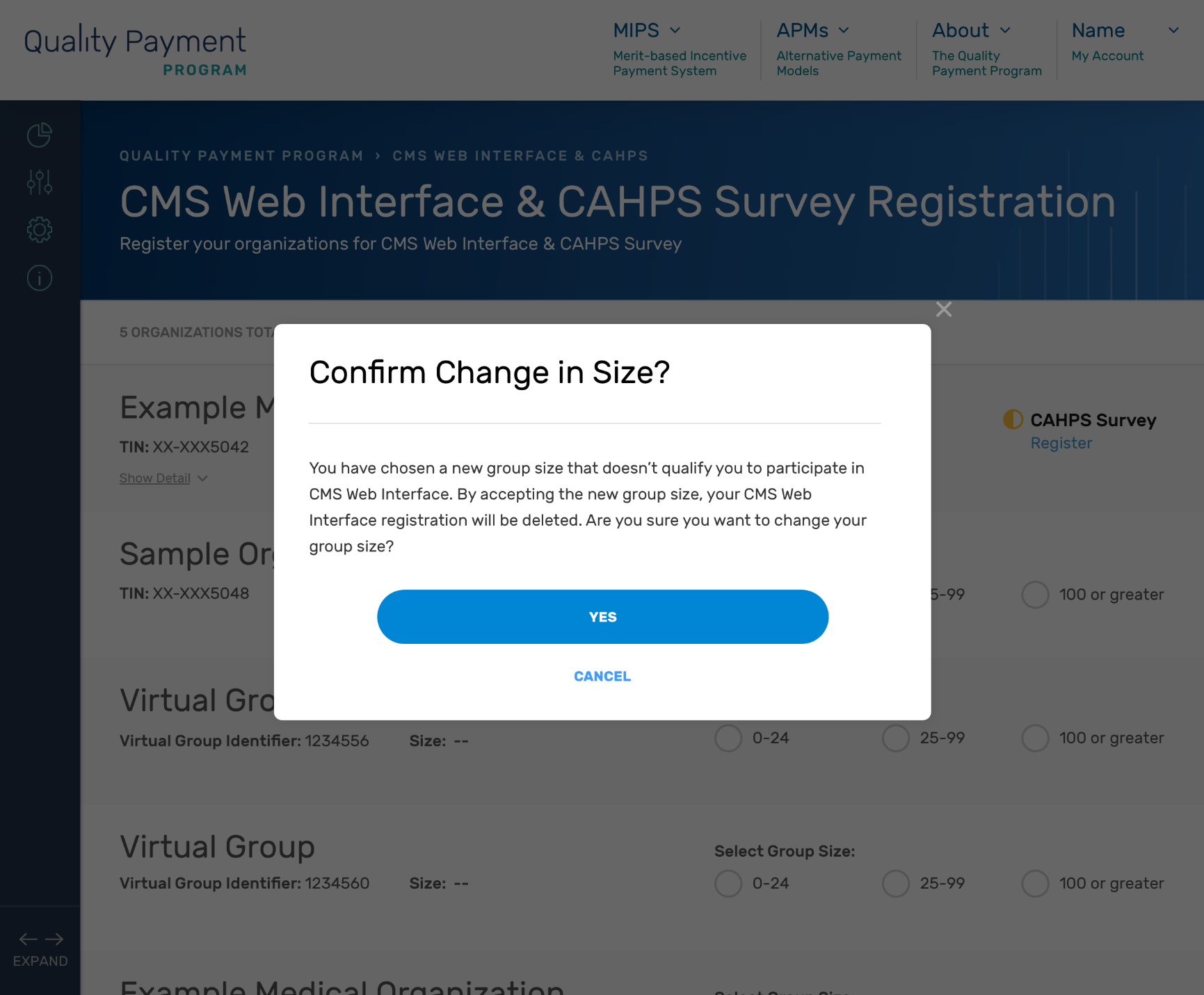 Note: If you are currently registered for the CMS Web Interface and select 2-24 as the group size, the confirmation message will indicate that accepting the change in size will cancel any existing CMS Web Interface registration because the CMS Web Interface is only available to groups with 25 or more eligible clinicians (including at least one MIPS eligible clinician).”