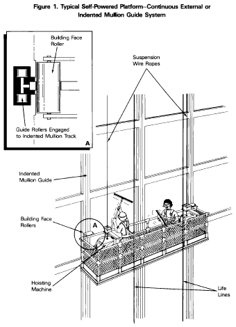 Angulated roping means a suspension method where the upper point of suspension is inboard from the attachments on the suspended unit, thus causing the suspended unit to bear against the face of the building.