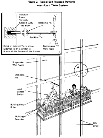 Intermittent stabilization means a method of platform stabilization in which the angulated suspension wire rope(s) are secured to regularly spaced building anchors.