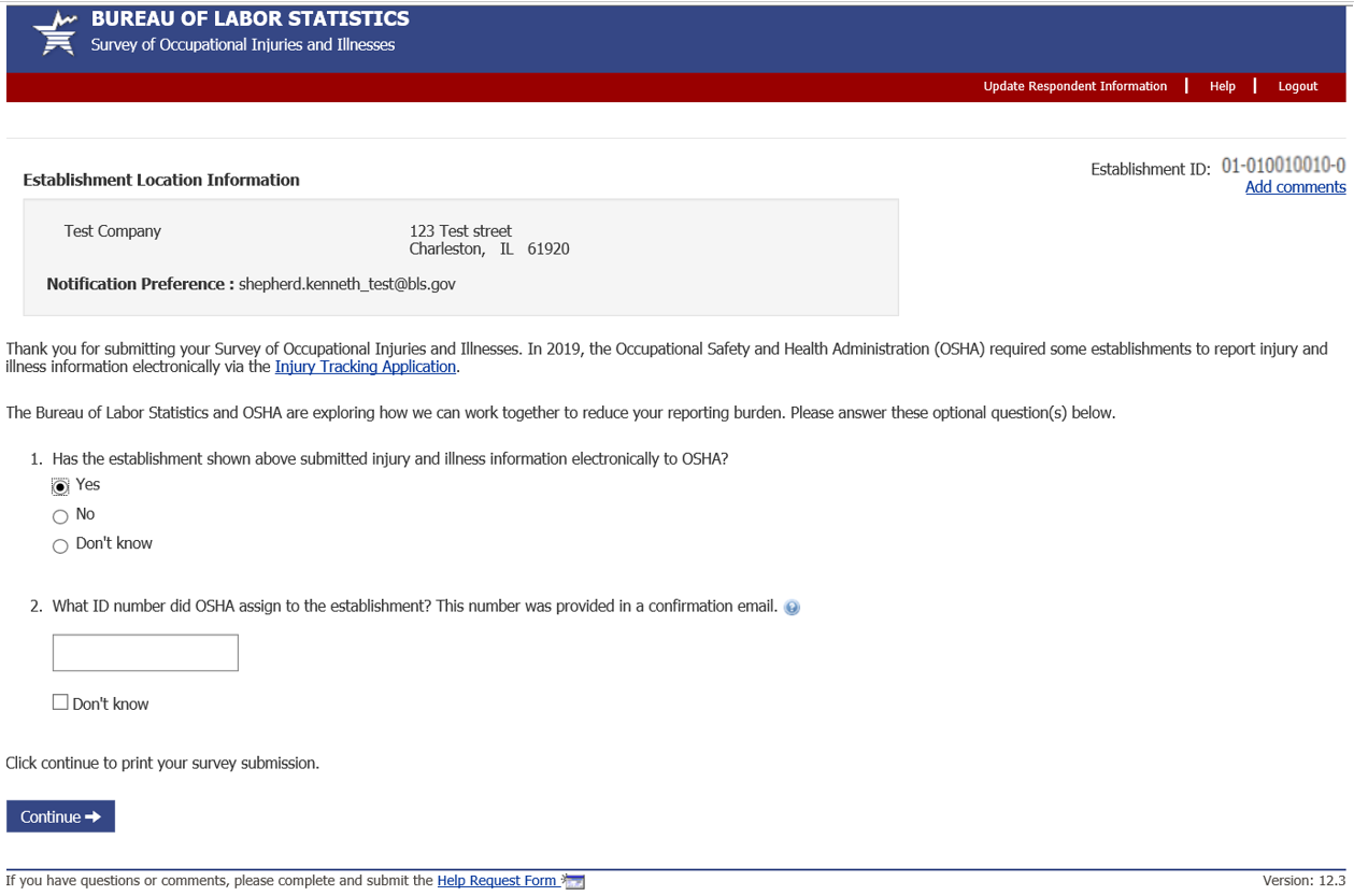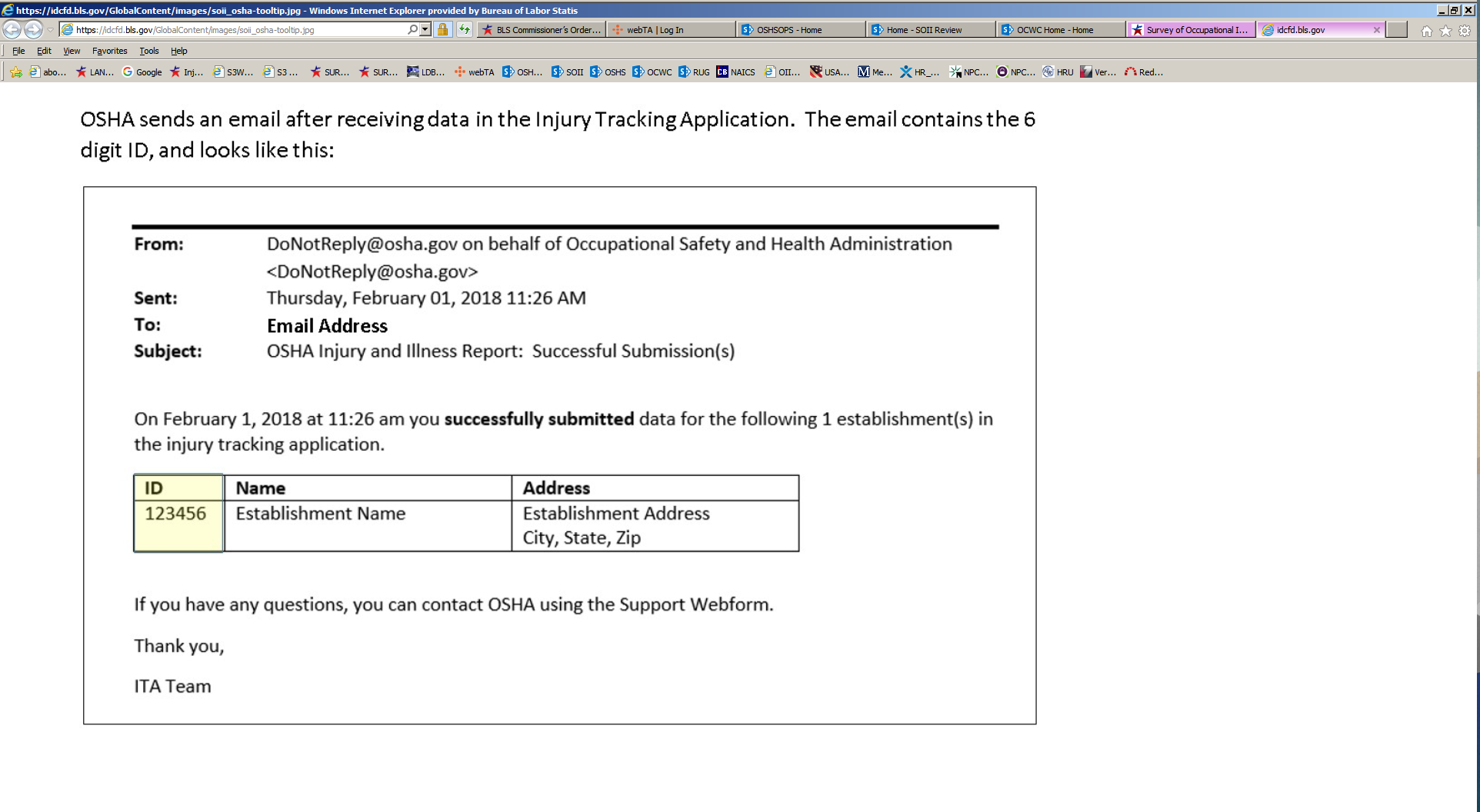 Sample OSHA ITA submission reply: Clicking on the ? icon at the end of question 2 provides a sample email that OSHA ITA respondents received upon successful submission to ITA. (Note: this example opens on a separate browser tab.)