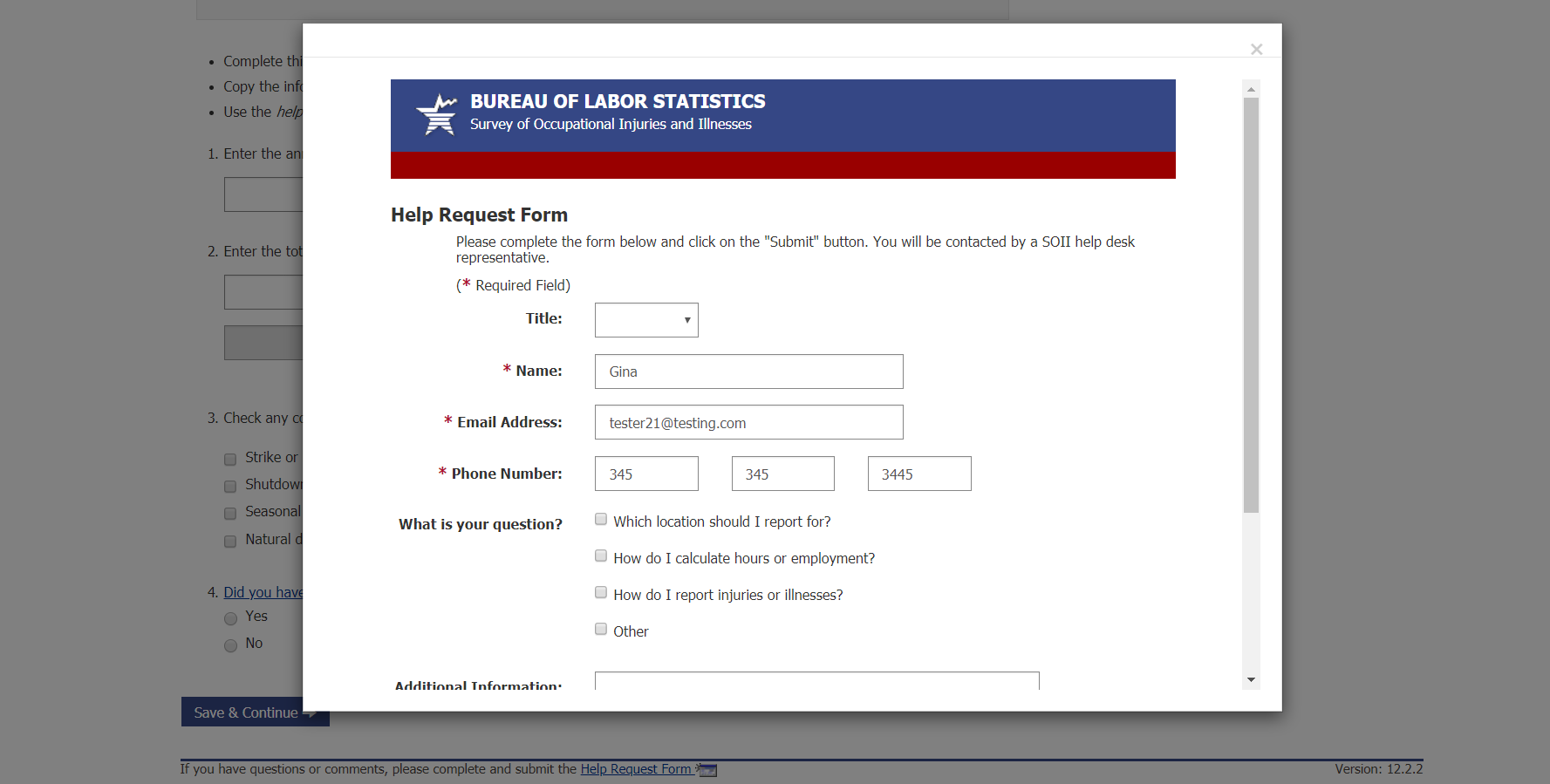 From screen above, or any screen within the survey, users can click on the “Help Request Form” link on the bottom of the page to send a question to the helpdesk. The Help Request Form is shown below. This year we added a Salutation drop down so that our helpdesk staff can address users properly: