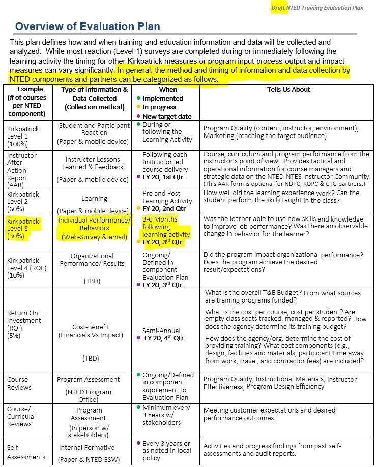 As stated in preceding paragraph; TPP, CDP, and EMI all utilize the Kirkpatrick Four Level Training Evaluation Model to assess training effectiveness. Donald Kirkpatrick developed the four-level model of training evaluation: Level 1 evaluation captures the students’ perception or reaction to training; Level 2 completes a pre-post comparison of learning via tests/examinations and performance assessment checklists of the student learning (change in behavior). Level 3 evaluation instruments capture how the training transfers to the students’ work environment and their particular job; and Level 4 captures information about the return on key stakeholder expectations of the course or training program. The data collected by these training evaluation forms is shared with representatives from each course/program’s respective target audience during three-year course/program reviews. All three organizations analyze the data to determine what revisions are needed in curriculum, delivery and to elicit inputs to improve training while providing documentation as to how training was applied, and how it impacts the individual and organization. The supporting statements immediately below are for each NTED component: