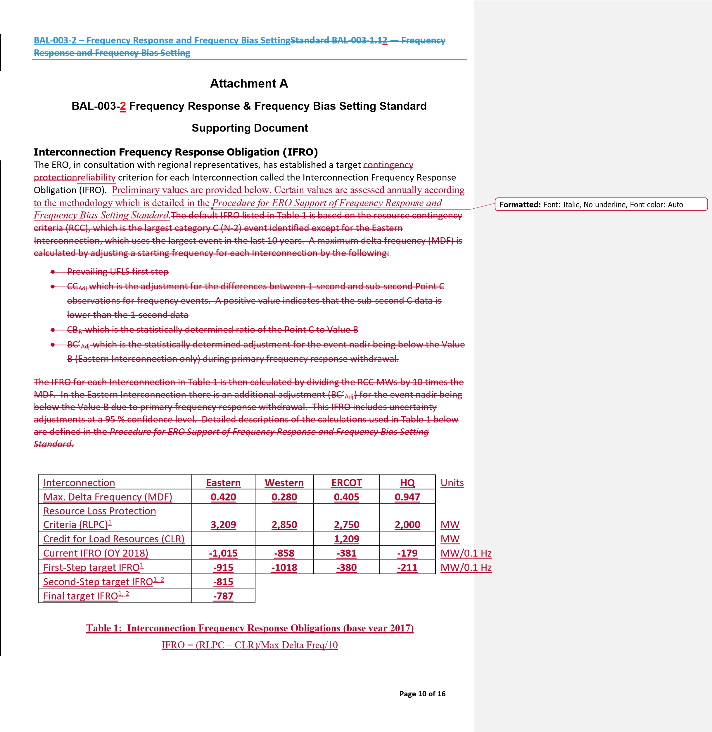 Attachment A to the standard discusses the establishment of the Interconnection Frequency Response Obligation (“IFRO”). The IFRO is the minimum amount of Frequency Response that must be maintained by an Interconnection. Attachment A also describes the process the ERO follows to validate the Balancing Authority’s Frequency Response Standard (“FRS”) Form 1 data and publish the official Frequency Bias Settings. FRS Form 1 provides the instructions and calculations to measure Frequency Response performance at the Balancing Authority level. The Procedure for ERO Support of Frequency Response and Frequency Bias Setting Standard, or Procedure, outlines how the ERO conducts a transparent process annually to identify a list of frequency events to be used by Balancing Authorities to calculate their Frequency Response performance to assess whether the Balancing Authority met its Frequency Response Obligation and to determine an appropriate Frequency Bias Setting.