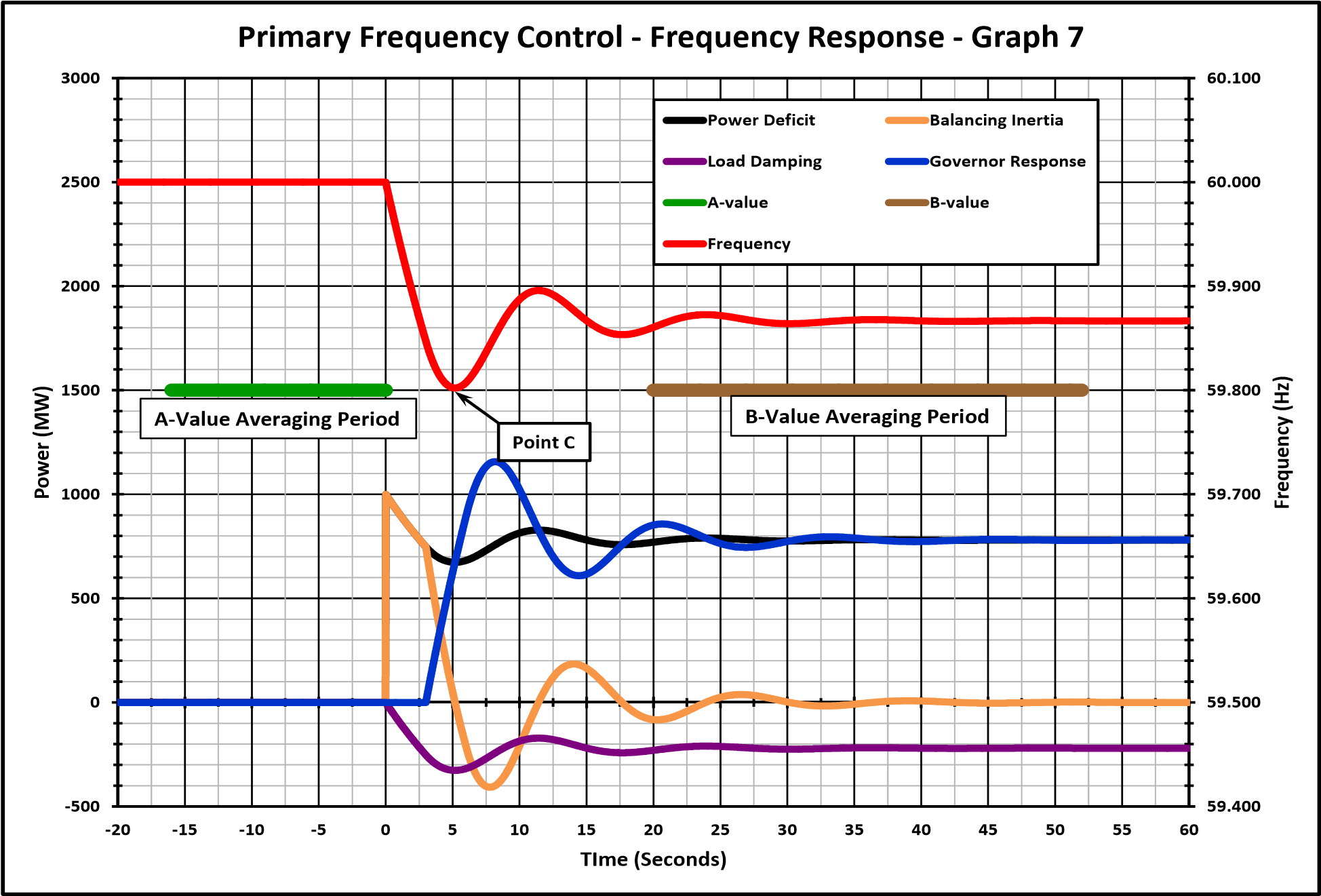 seconds specified in BAL‐003‐1. Therefore, some events are characterized with a Point C value that is only partially down the arresting period of the event and does not accurately reflect the actual nadir. BAL‐003‐1 should be modified to allow for accurate representation of the Point C nadir value if exceeding t0+12 seconds. The actual event nadir can occur at any time, including beyond the time period used for calculating Value B (t0+20 through t0+52 seconds), and may be the value known as Point C’ which typically occurs from 72 to 95 seconds after t0.
