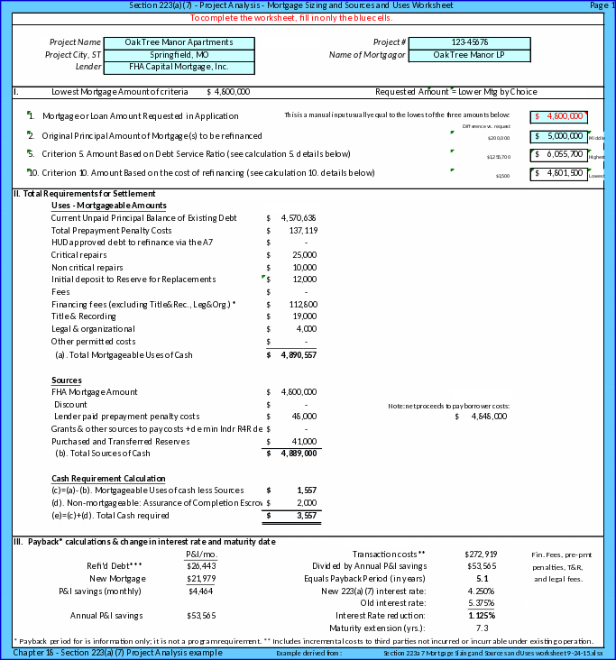 Project Analysis. Lenders must provide an analysis with their applications which provides details about the sizing of the Section 223(a)(7) mortgage consistent with this guidance and a Sources and Uses statement consistent with such mortgage sizing calculations. The following may serve as an example of the content and presentation of a submitted Project Analysis: