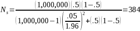 A population of 1 million or more, the required sample size is 384 for the following parameters: