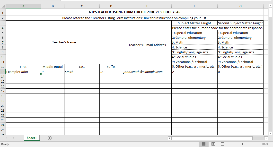 When the respondent clicks “Click here to Download the Excel Template,” the Excel template is as follows: