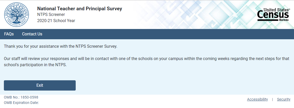 The NTPS Screener is a web-based survey, the purpose of which is to collect basic information about the school, confirm the eligibility of the school in the NTPS, and establish a point of contact at the school (a “survey coordinator”) for subsequent NTPS data collection operations.