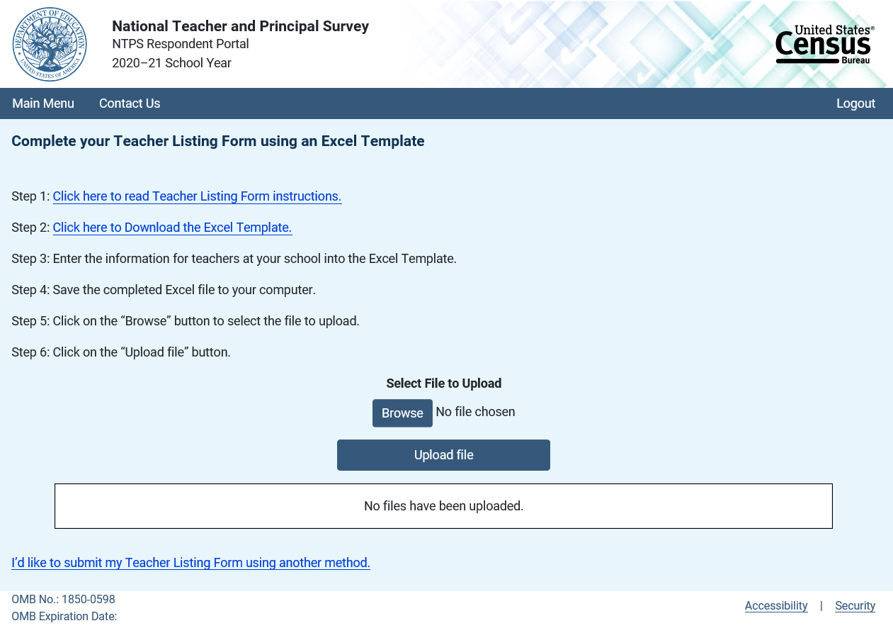 Respondents in schools that do not have a pre-populated Teacher Listing Form are given two options to complete their Teacher Listing Form, as shown below.