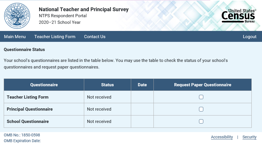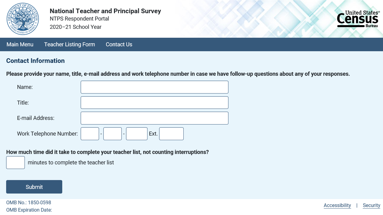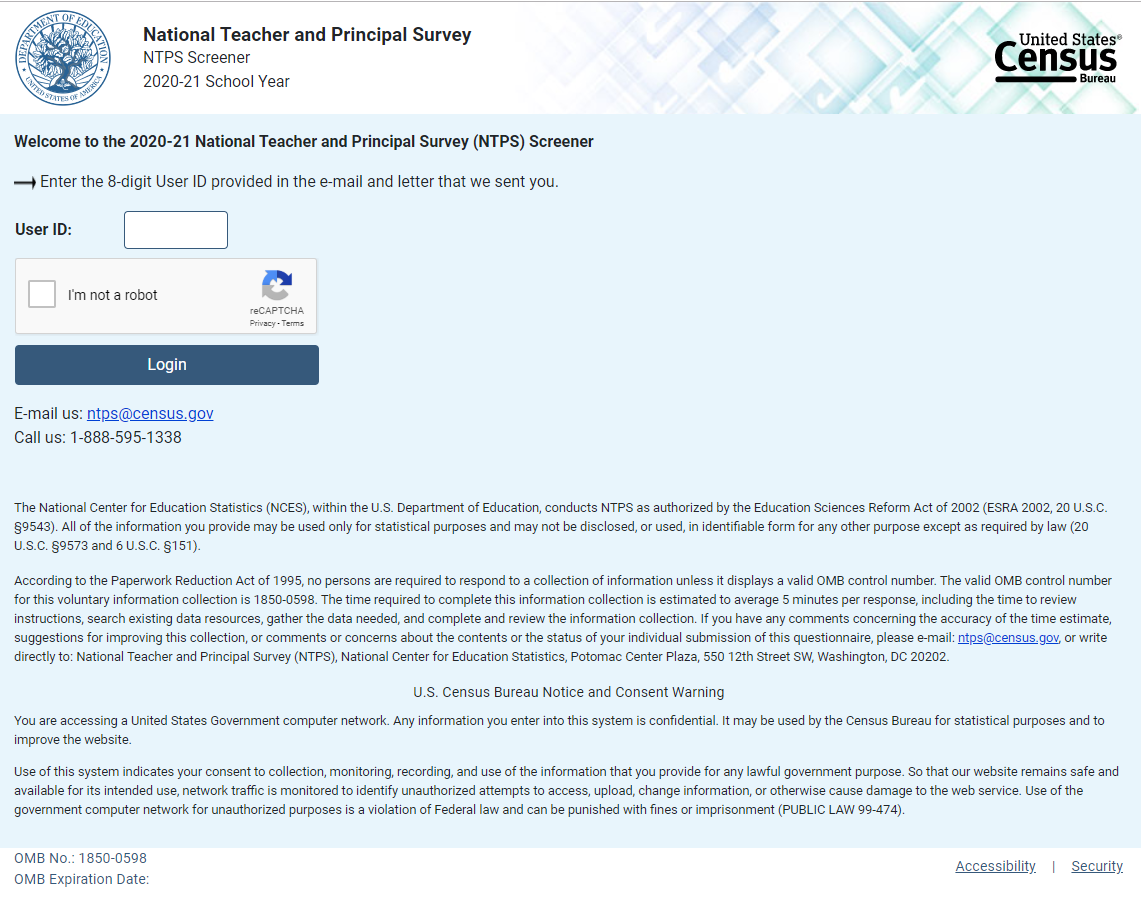 NTPS Online Screener and Respondent Portal Website Including Teacher Listing Form (TLF)