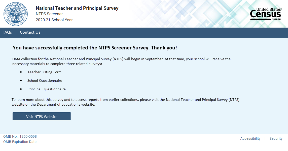Clicking the “Visit NTPS Website” directs the respondent to https://nces.ed.gov/surveys/ntps/