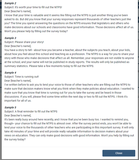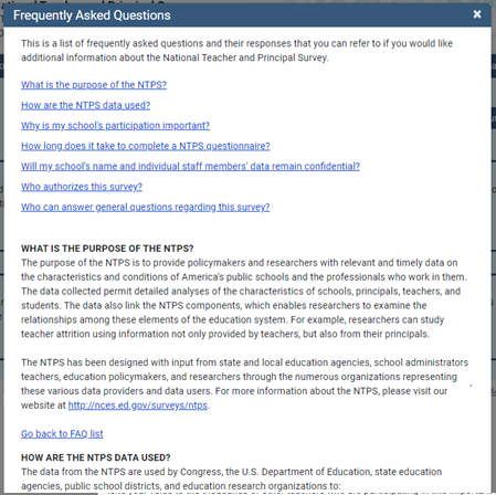 This is a list of frequently asked questions and their responses that you can refer to if you would like additional information about the National Teacher and Principal Survey.
