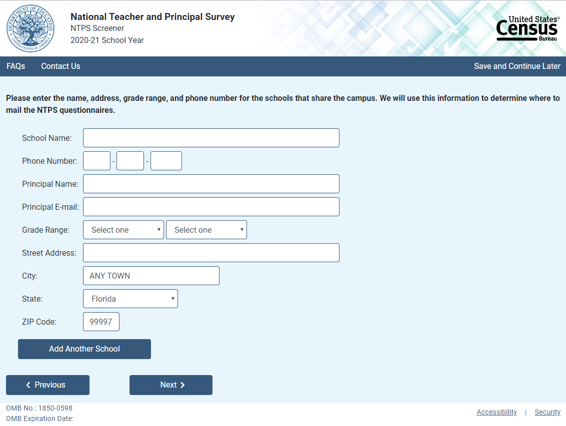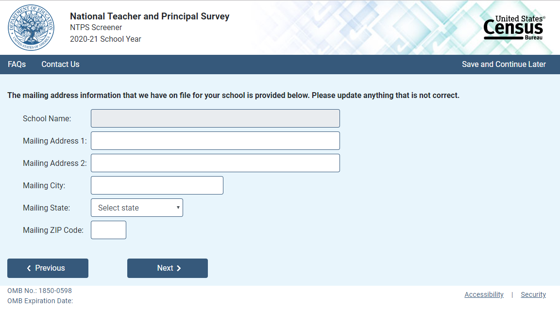 NOTE: Name and address fields are pre-filled with the sampled school’s information; however, only the address fields (not school name) can be edited on this page.
