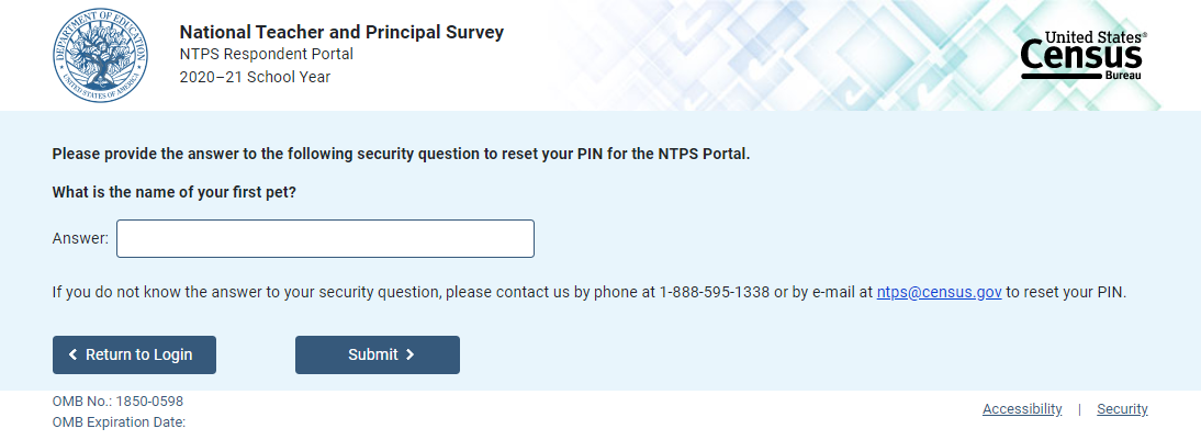 Please contact the U.S. Census Bureau at 1-888-595-1338 if you have any questions about the survey. Someone will be available to take your call Monday through Friday, between 8:00 a.m. and 8:00 p.m. (Eastern Time). At any other time, please leave a message and someone will return your call as soon as possible. The U.S. Census Bureau is also available to answer your questions via e-mail at ntps@census.gov.