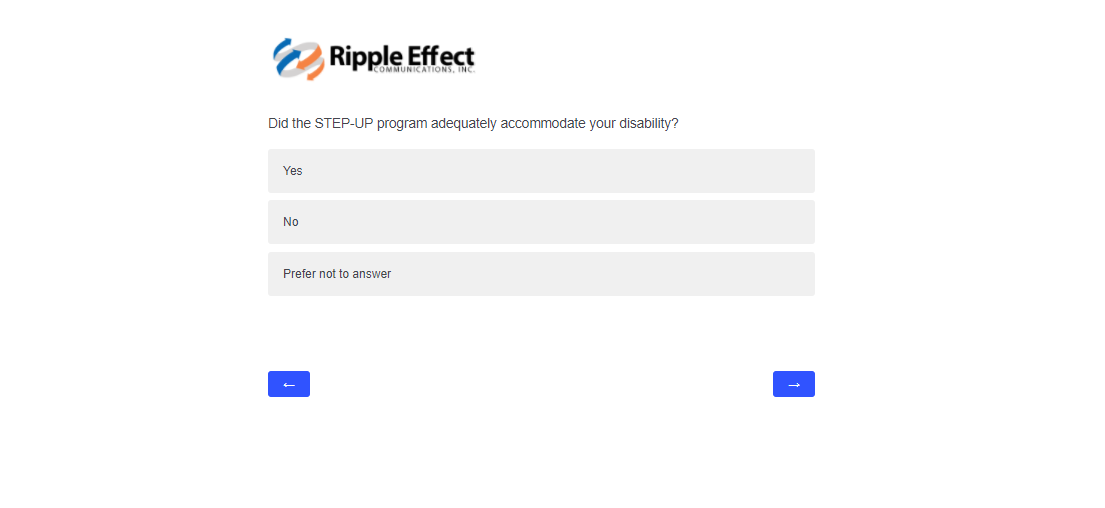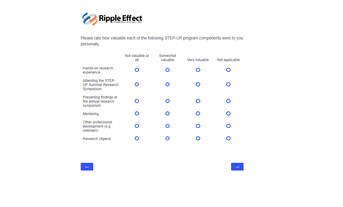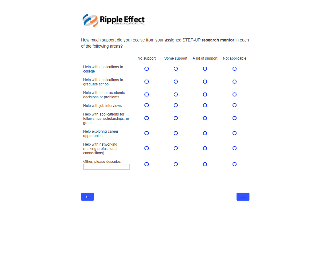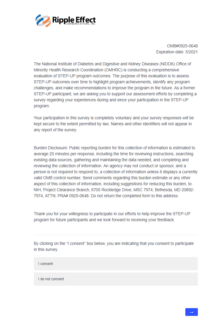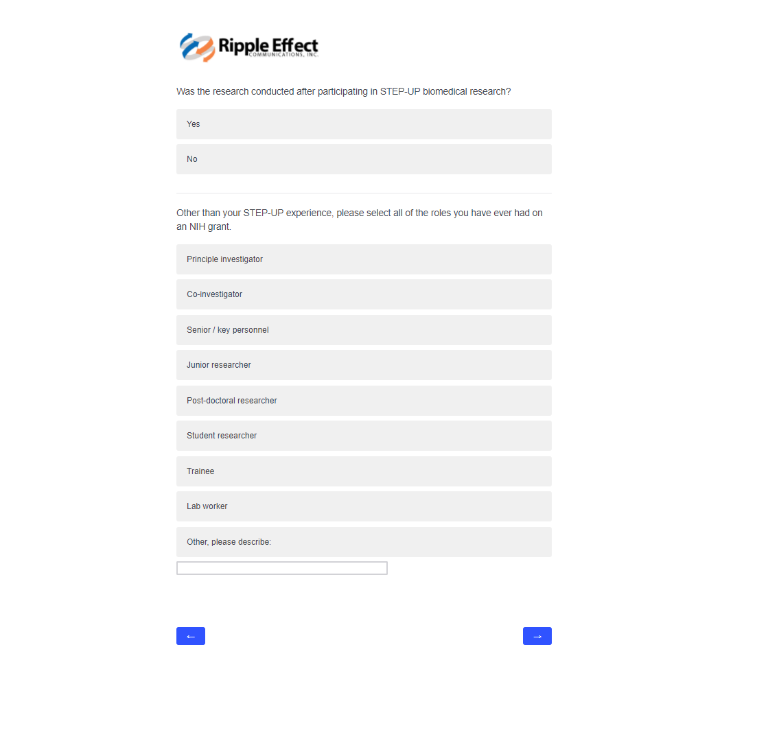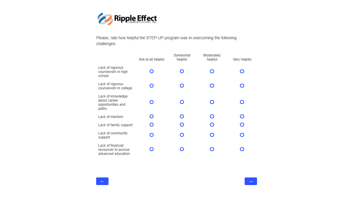 This attachment includes screenshots for each part of the participant survey. The same survey will be used in the evaluation of STEP-UP and DSRTP. However, the name of the program in each question will reflect the program in which the respondent participated.