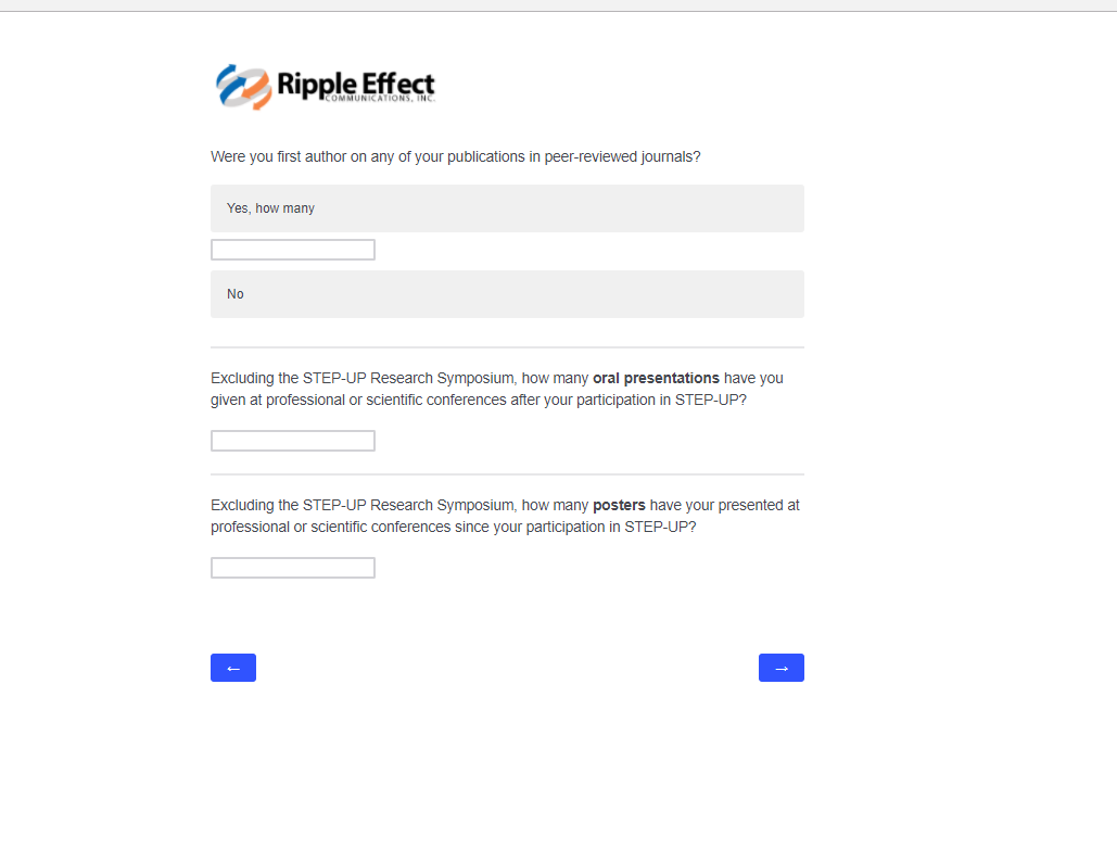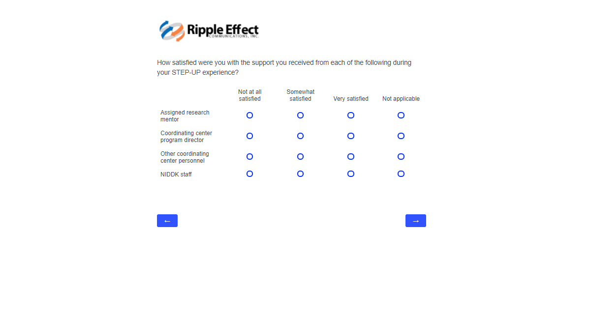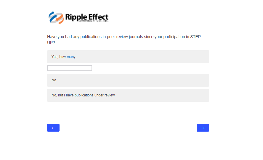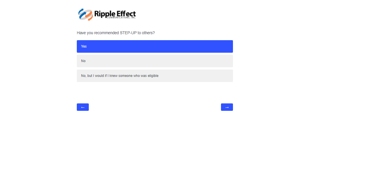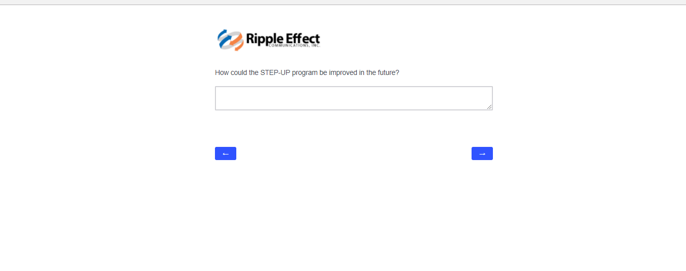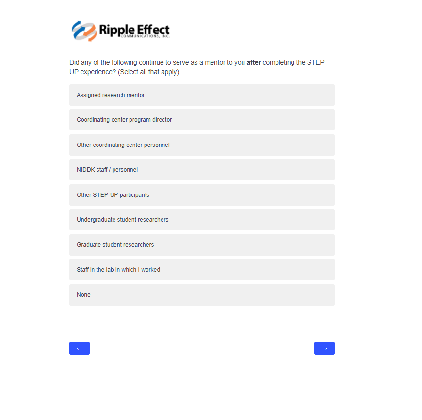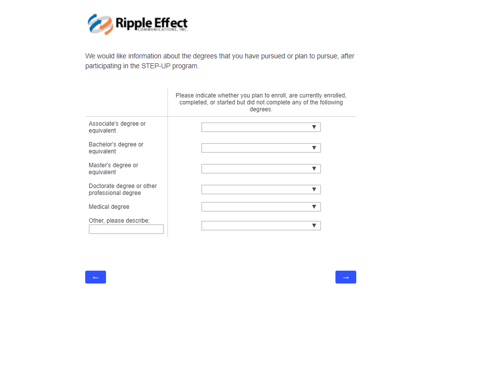 This attachment includes screenshots for each part of the participant survey. The same survey will be used in the evaluation of STEP-UP and DSRTP. However, the name of the program in each question will reflect the program in which the respondent participated.