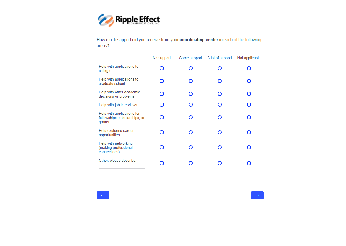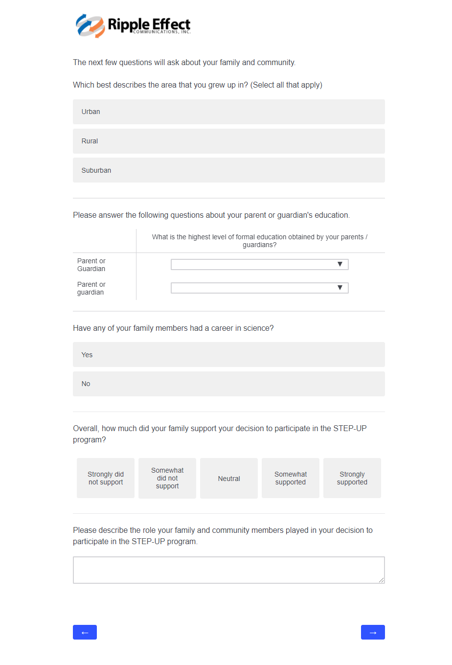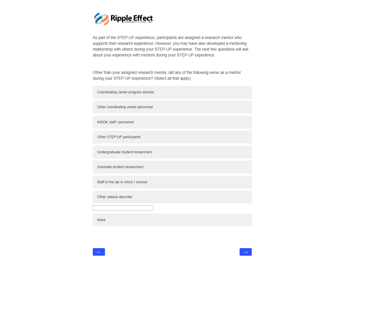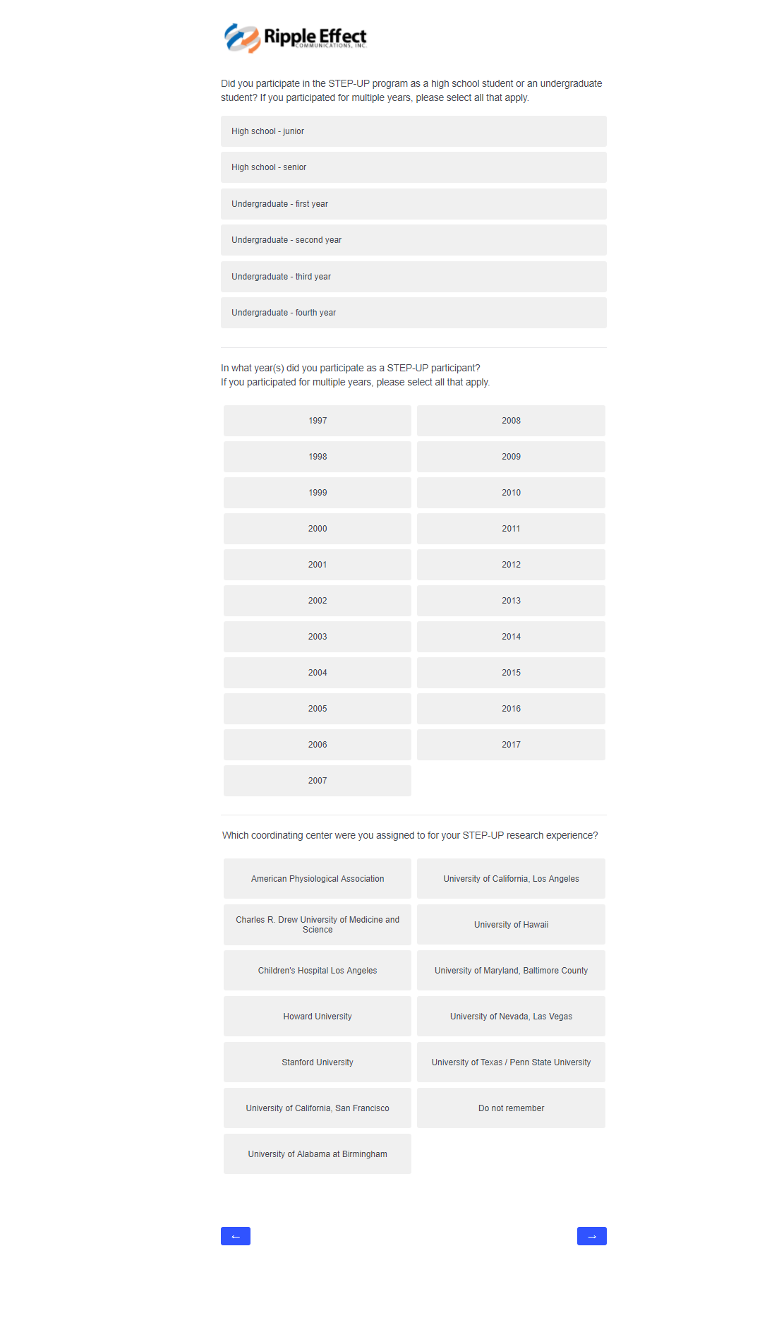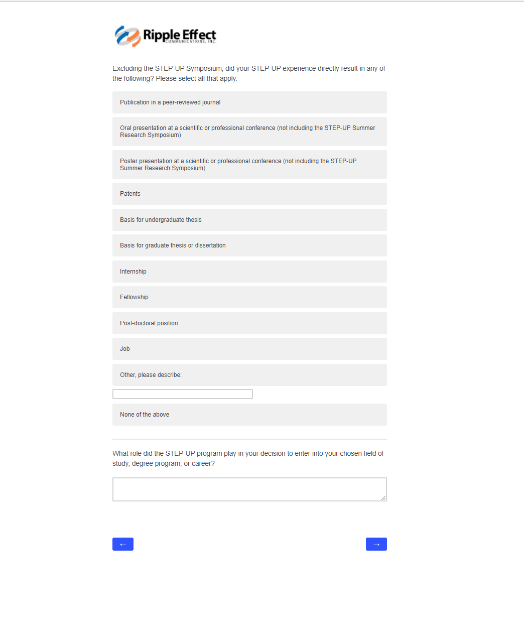 This attachment includes screenshots for each part of the participant survey. The same survey will be used in the evaluation of STEP-UP and DSRTP. However, the name of the program in each question will reflect the program in which the respondent participated.