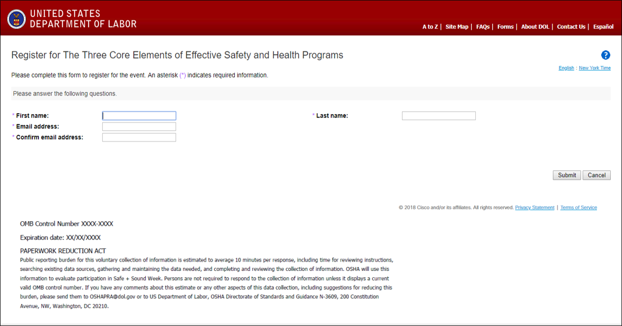 Public reporting burden for this voluntary collection of information is estimated to average 10 minutes per response, including time for reviewing instructions, searching existing data sources, gathering and maintaining the data needed, and completing and reviewing the collection of information. OSHA will use this information to evaluate participation in Safe + Sound Week. Persons are not required to respond to the collection of information unless it displays a current valid OMB control number. If you have any comments about this estimate or any other aspects of this data collection, including suggestions for reducing this burden, please send them to OSHAPRA@dol.gov or to US Department of Labor, OSHA Directorate of Standards and Guidance N-3609, 200 Constitution Avenue, NW, Washington, DC 20210.
