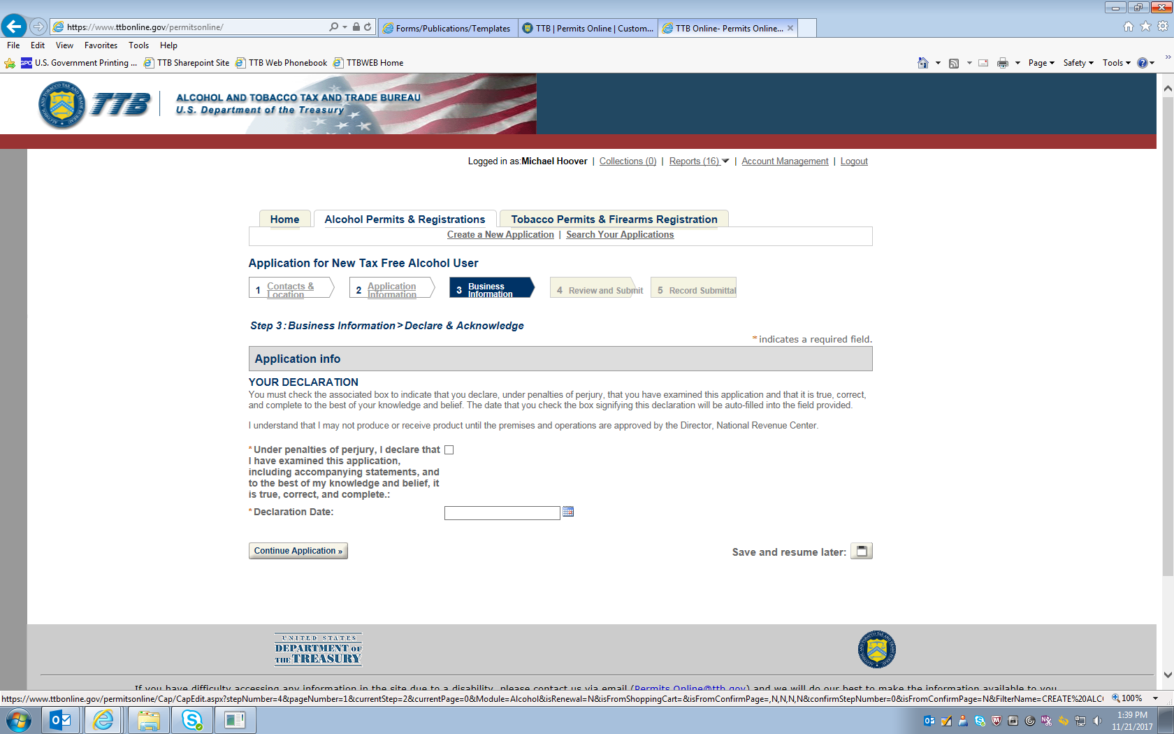 [The screens that follow allow the user to review the submitted information and then submit the completed application to TTB.]