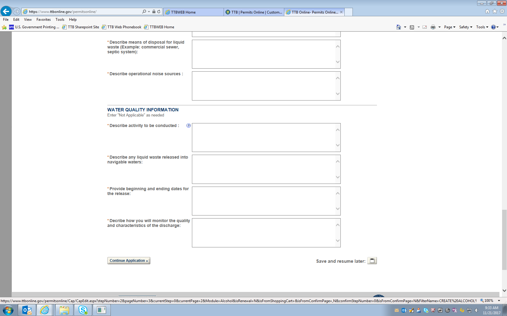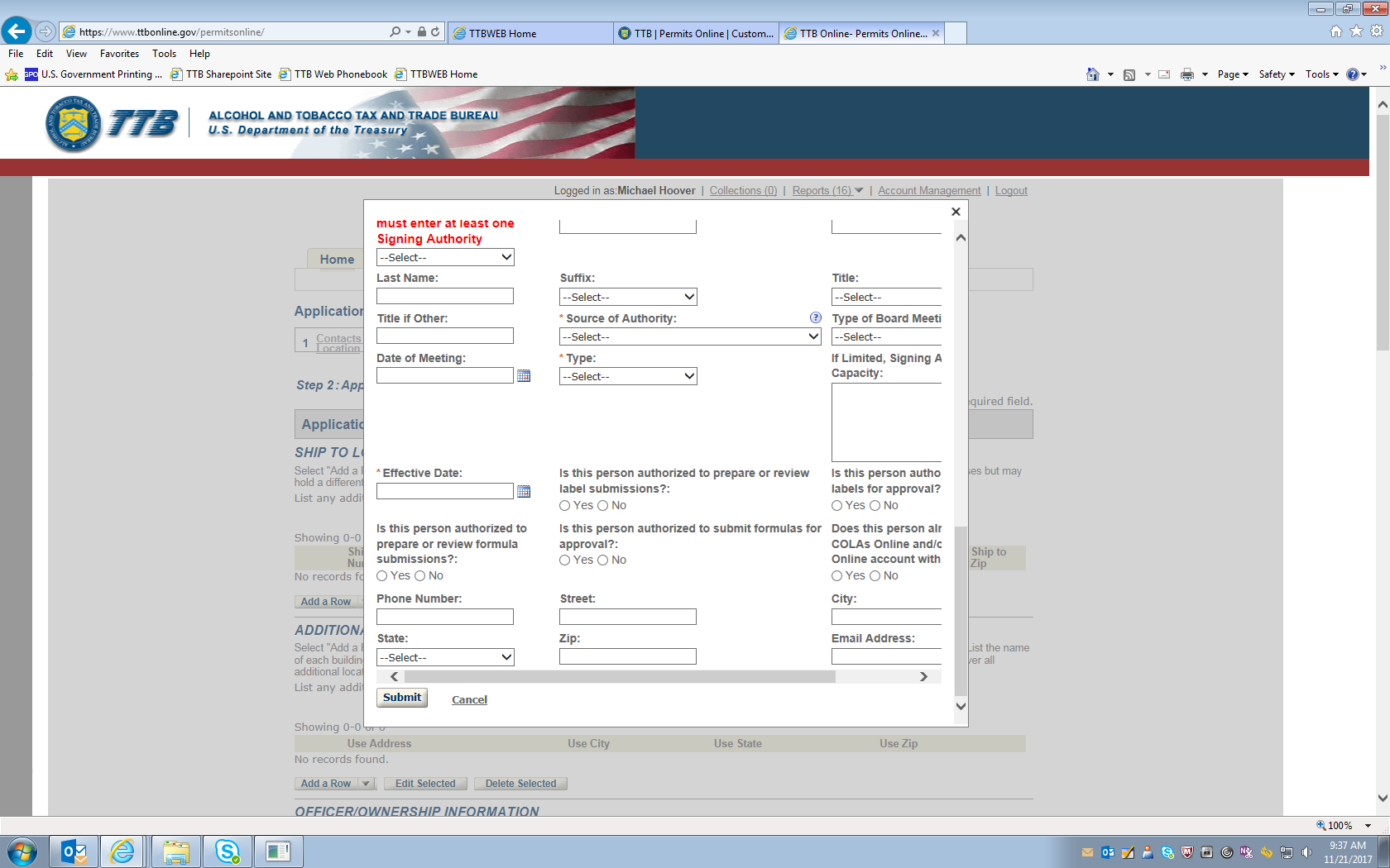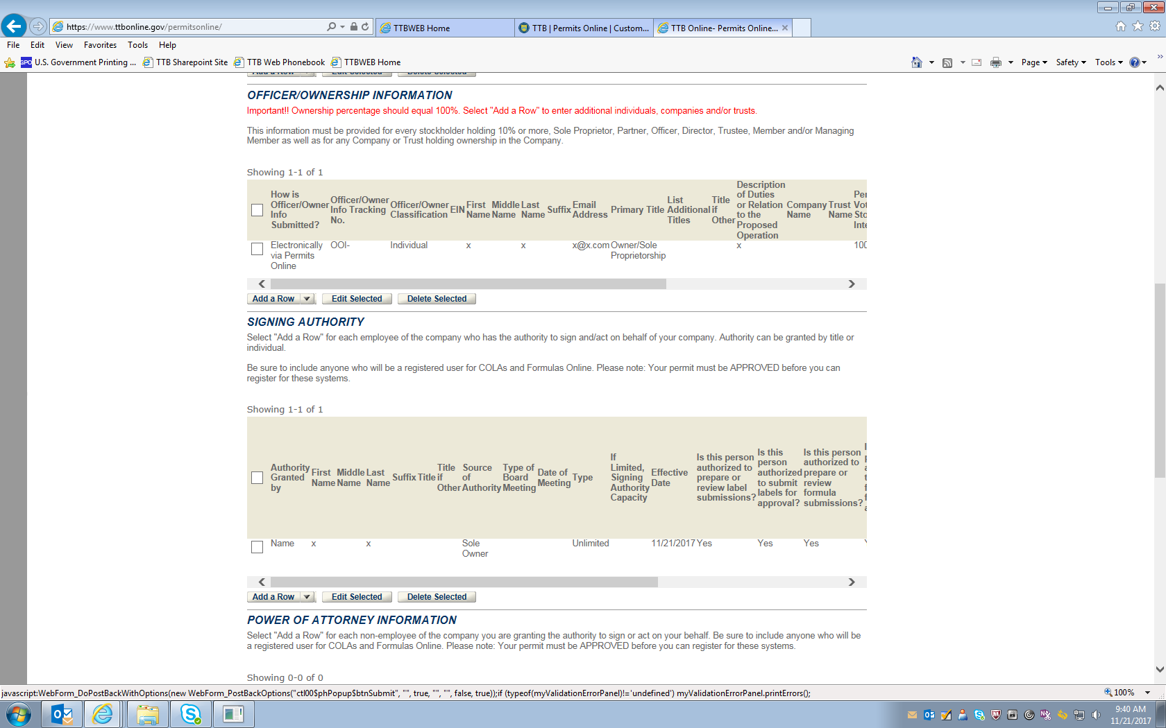 [The screens that follow allow the user to review the submitted information and then submit the completed application to TTB.]