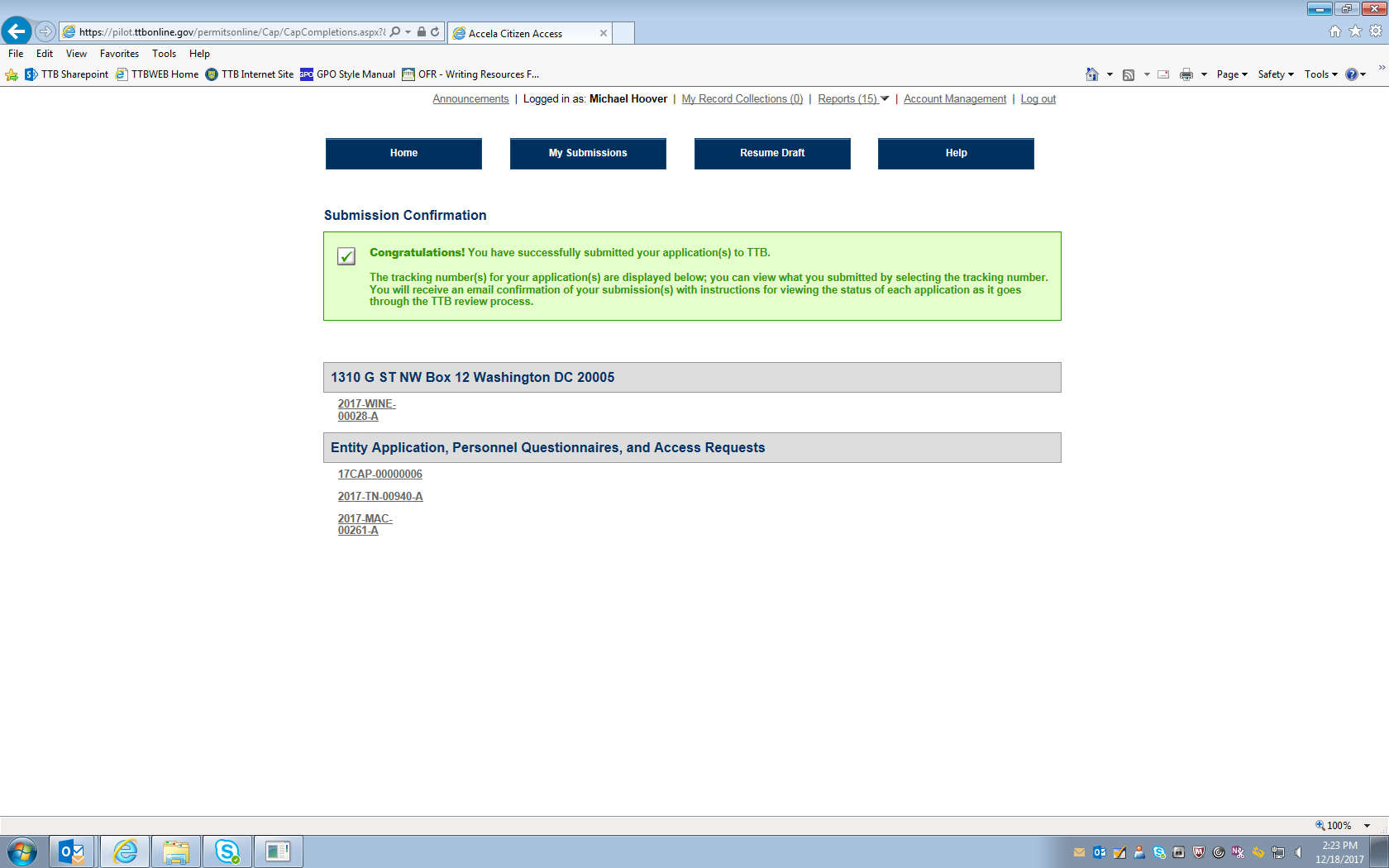 Figure 24 – Screen showing that the application(s) for amended basic permit under the FAA Act have been successfully submitted to TTB. Applicant will receive an e-mail from TTB when the application(s) are approved or if they are rejected.
