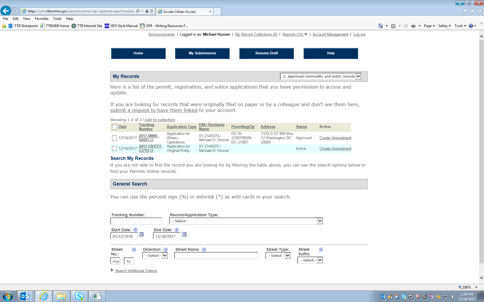 Figure 2 – The respondent then selects the existing permit to be amended, or the respondent may use the “Search” function to locate an existing permit that the respondent is authorized to amend. In either case, the respondent will click on the “Create Amendment” link for the permit to be amended.