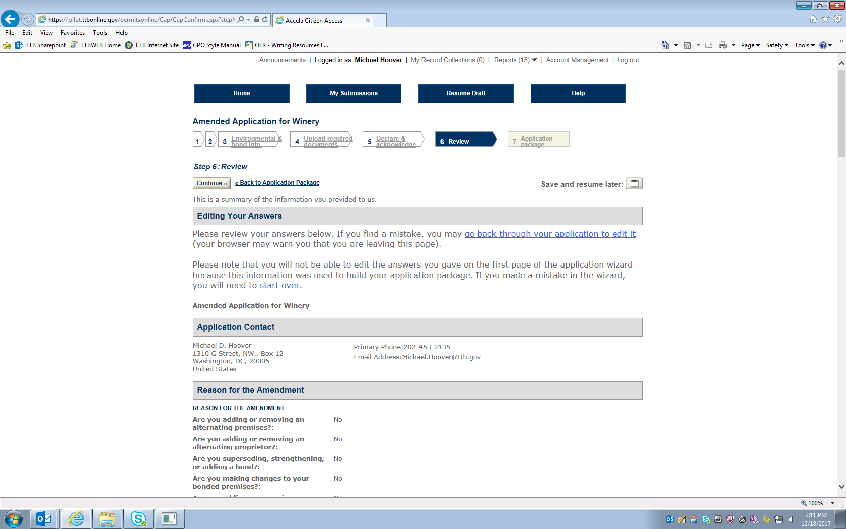 Figure 13 – This screen (which continues on the next three pages below) shows the current information for the winery in question, and the respondent may amend any of the stated information on this screen. In this example, the “Doing Business Name” is amended from “Mike’s Best” to “Mike’s Very Best.”